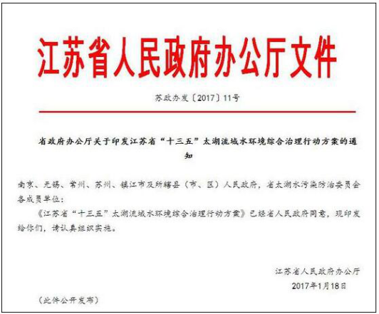 今年1月18日江蘇省政府辦公廳正式出臺的《江蘇省“十三五”太湖流域水環(huán)境綜合治理行動方案》(以下簡稱《方案》)將成為接下來一段時間內(nèi)治太的重要依據(jù)。